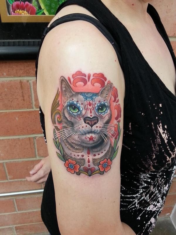 墨西哥传统彩色猫大臂纹身图案
