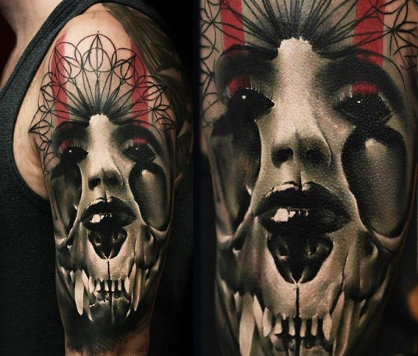 大臂彩色女性肖像结合骷髅与猫纹身图案