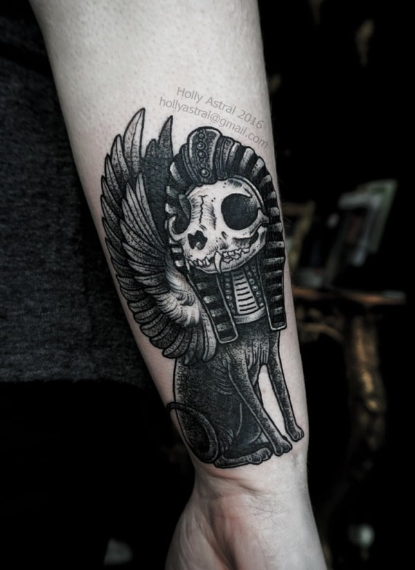 小臂石雕风格有趣的埃及恶魔猫纹身图案