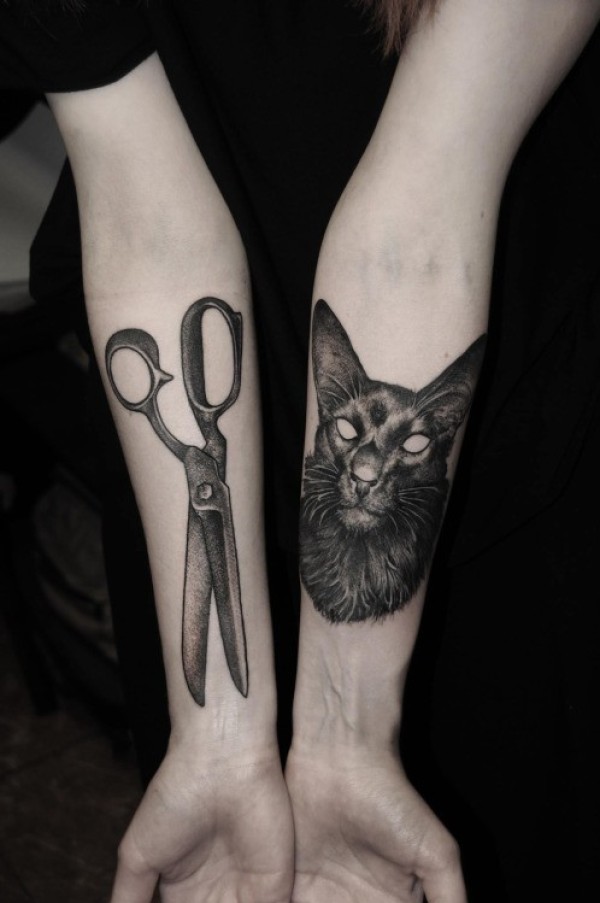 手臂恶魔猫与剪刀纹身图案