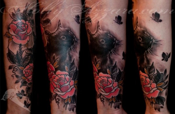 手臂可爱的猫与花朵和蝴蝶纹身图案