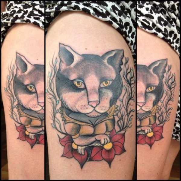 一只猫和红色的花朵纹身图案