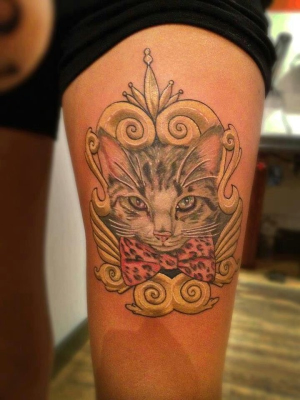 大腿彩色猫与蝴蝶结纹身图案
