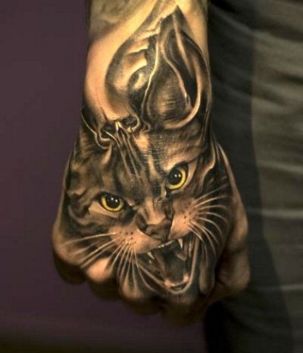 手背超现实猫与头骨纹身图案