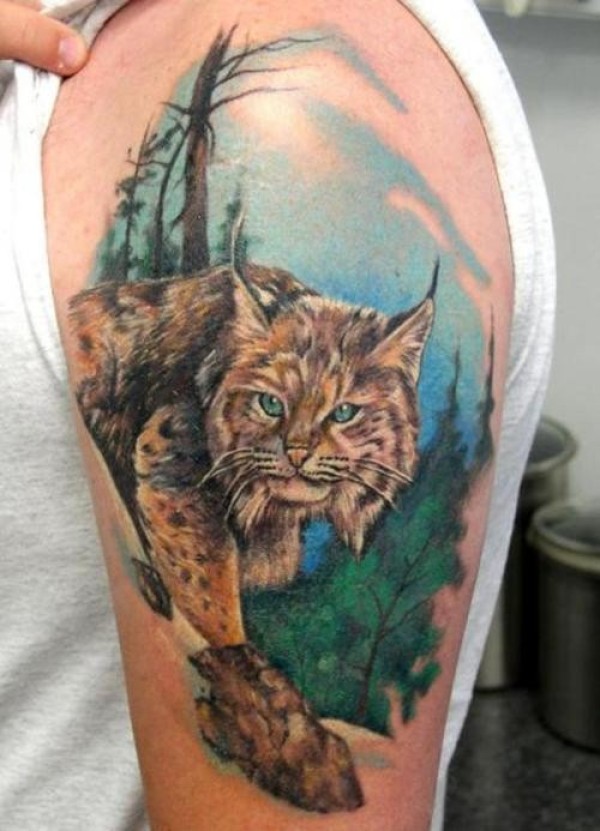 大臂惊人的彩绘逼真野猫纹身图案