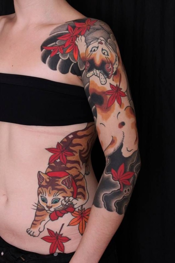 手臂和腰部可爱的猫咪枫叶彩色纹身图案
