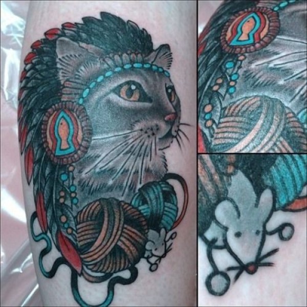 猫戴印度头饰与毛线球和老鼠纹身图案