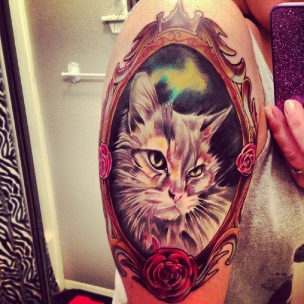 手臂彩色猫肖像纹身图案