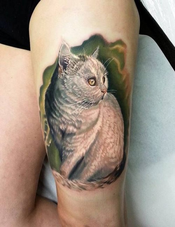 写实的白色猫大腿纹身图案