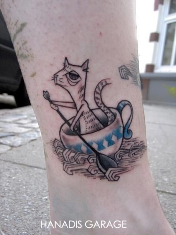 小腿茶杯里的猫纹身图案
