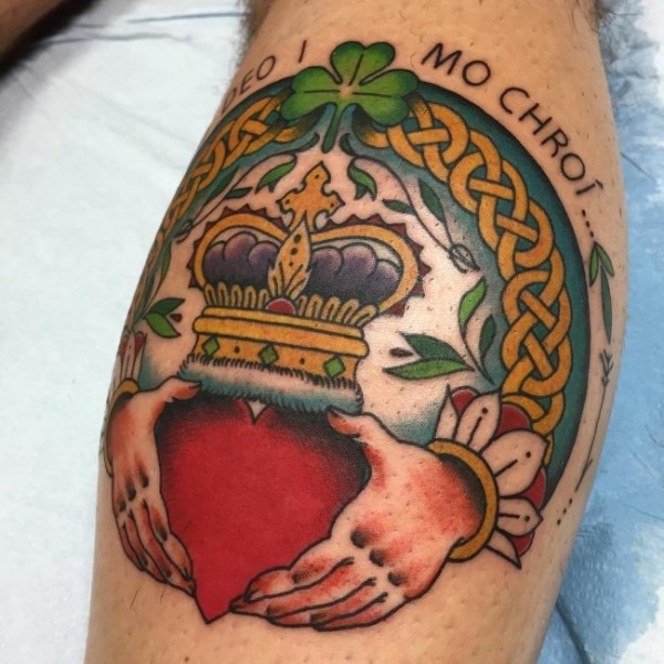 小腿圆形凯尔特结与皇冠心形纹身图案