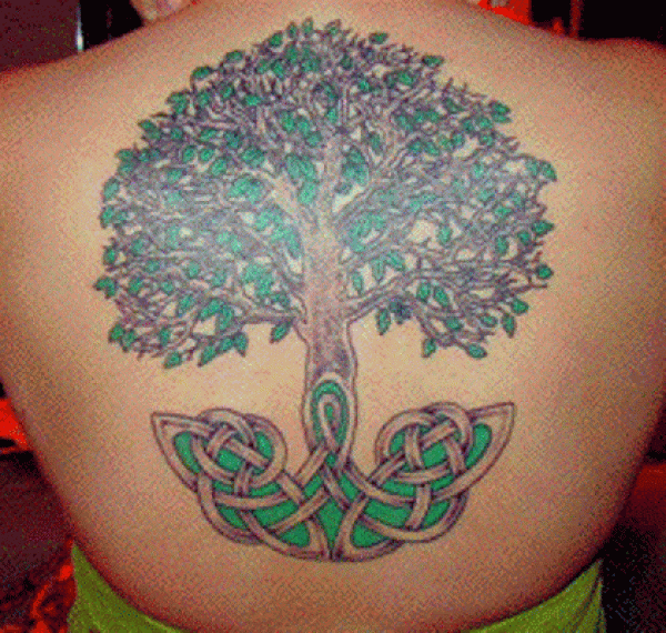 背部绿色的大树和凯尔特结纹身图案