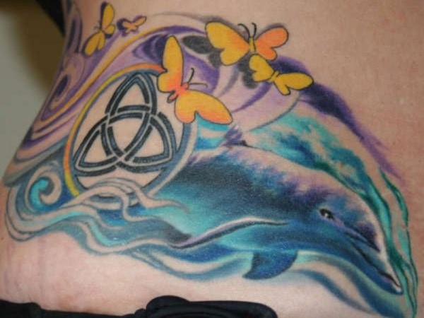 可爱的海豚与蝴蝶和凯尔特符号纹身图案