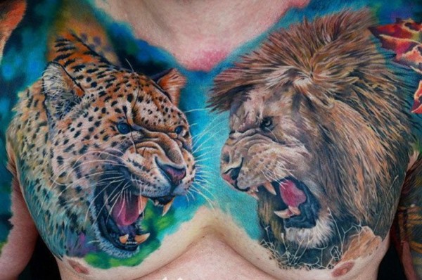 胸部令人印象深刻的猎豹与狮子纹身图案