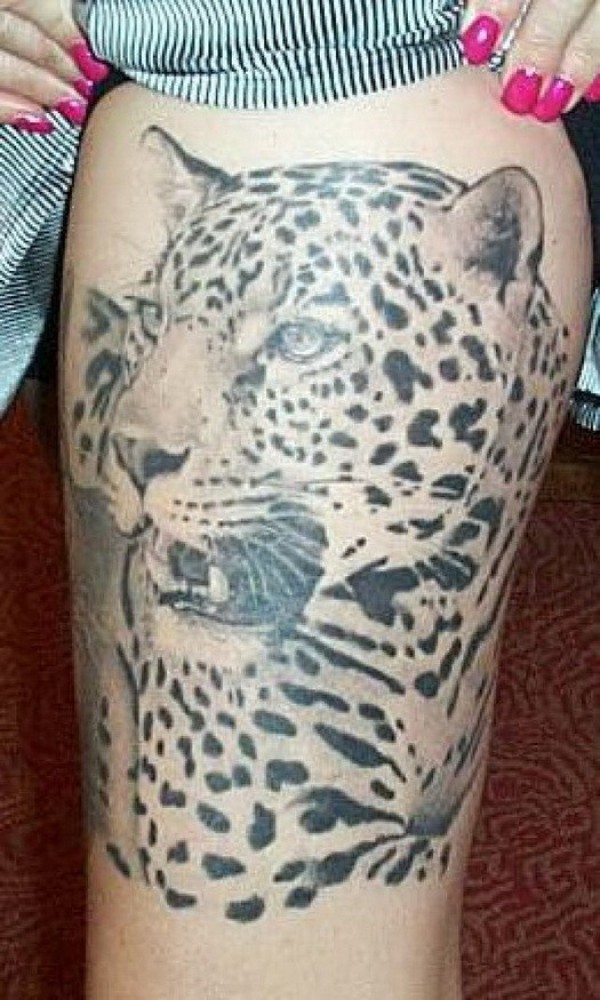 大腿巨大的黑白色猎豹头部纹身图案