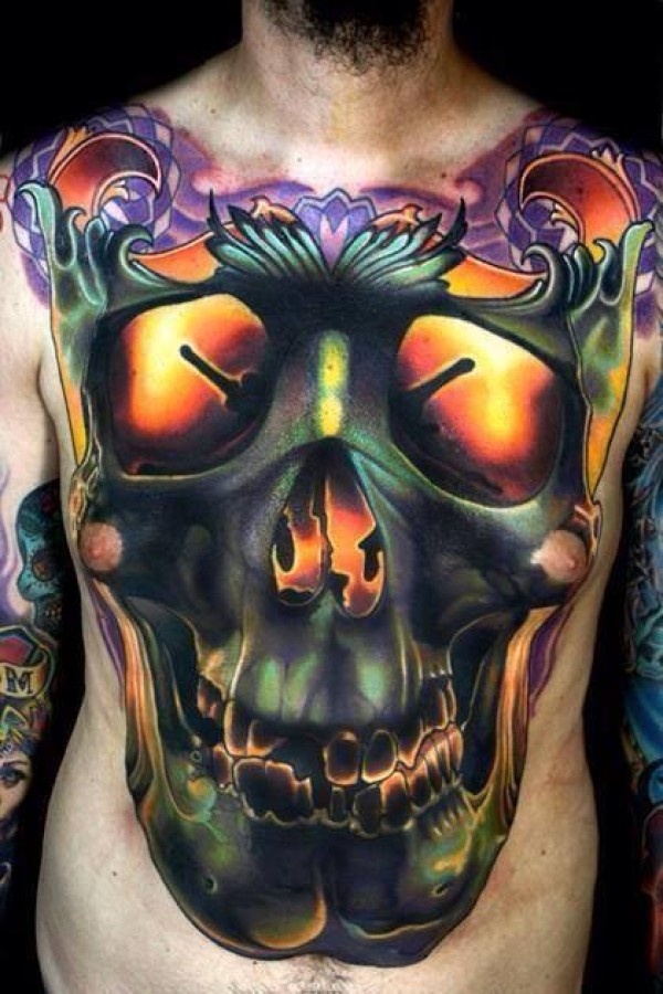 腹部华丽的彩色骷髅个性纹身图案