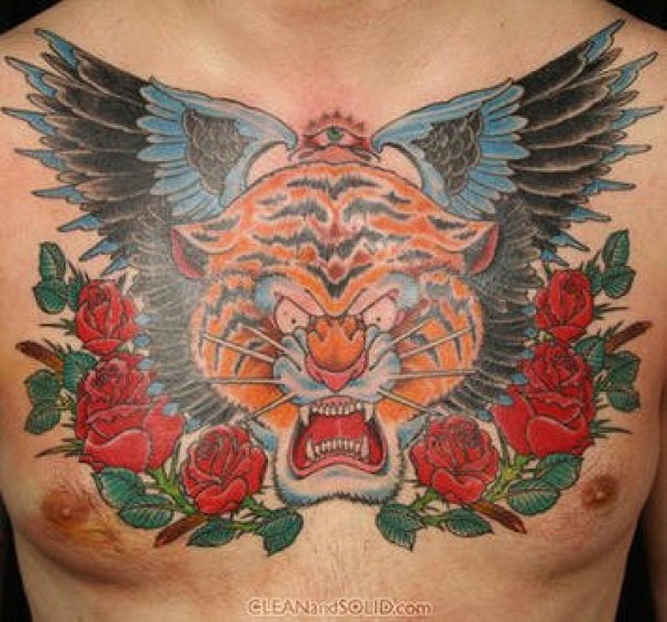 胸部有翅膀的老虎和玫瑰纹身图案