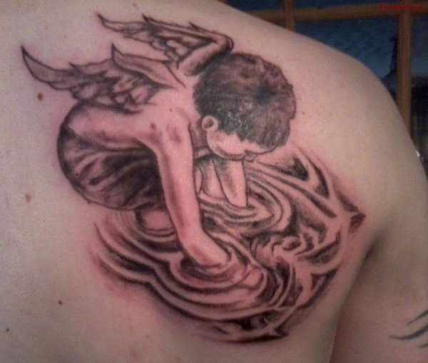 肩部小天使和水花纹身图案
