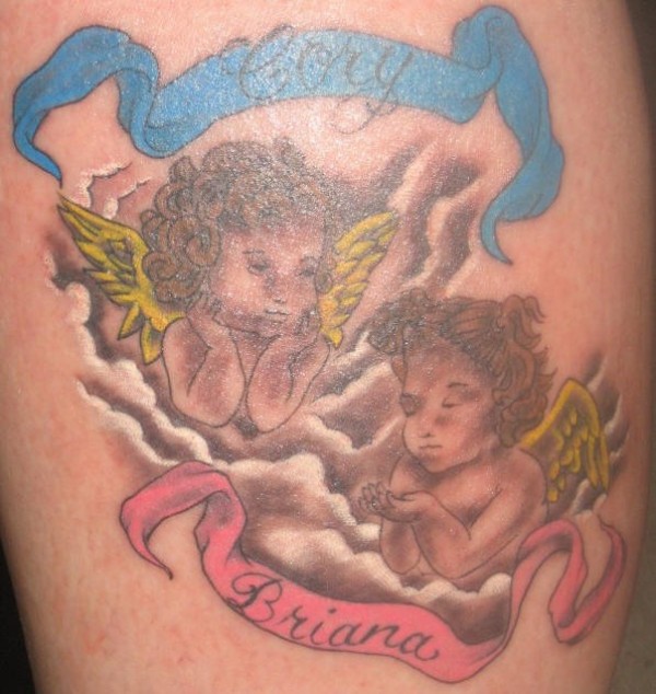 两个金色翅膀的小天使纹身图案