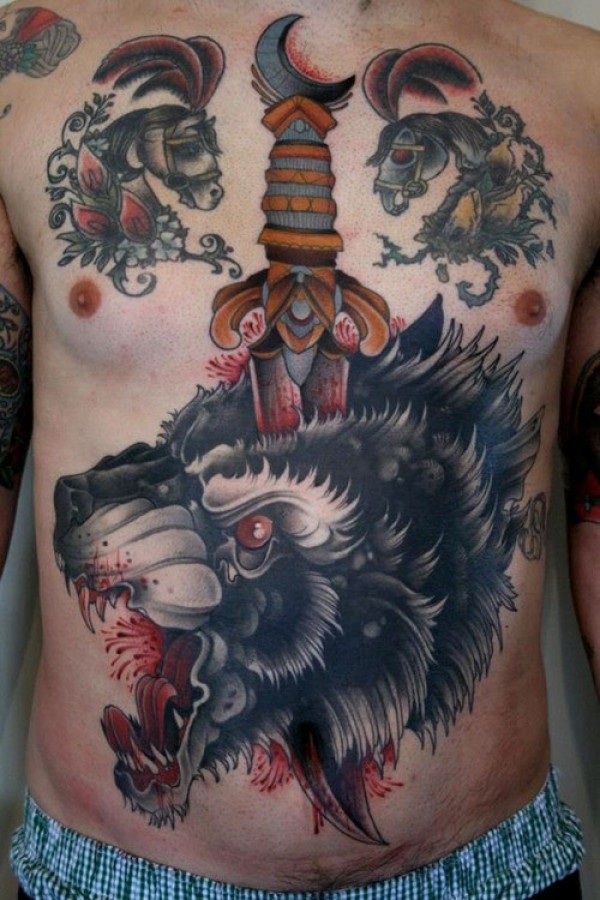 胸部和腹部令人毛骨悚然的彩色狼与血腥匕首纹身图案
