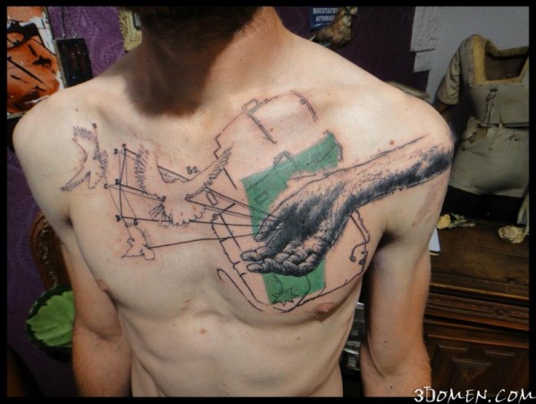胸部雕刻风格手与线条鸽子纹身图案