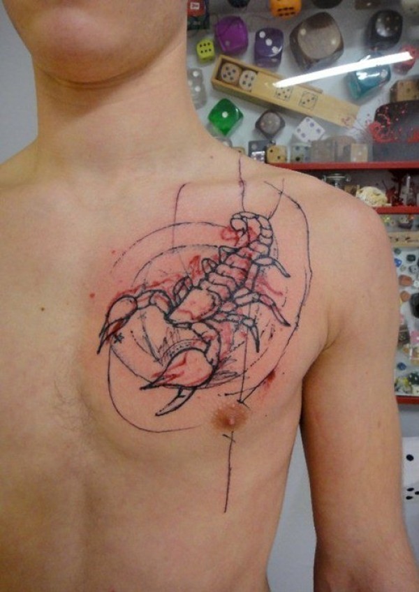 胸部简约的个性蝎子线条纹身图案
