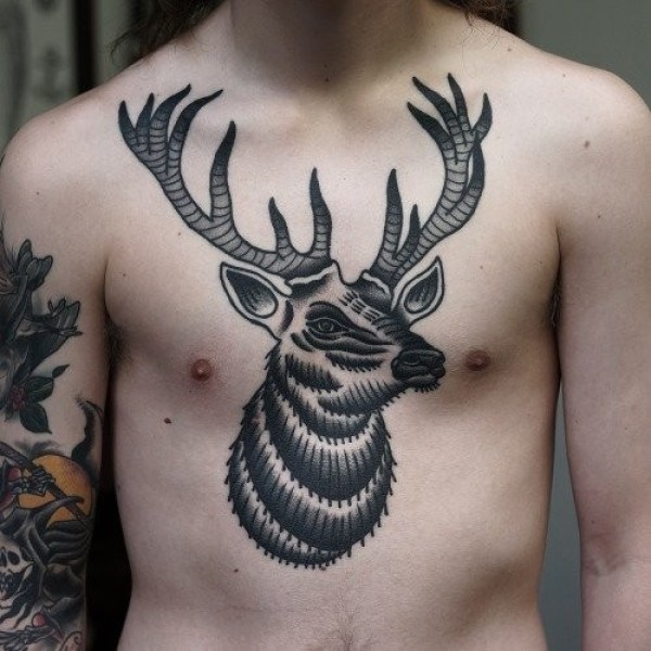胸部old school彩色个性鹿头纹身图案