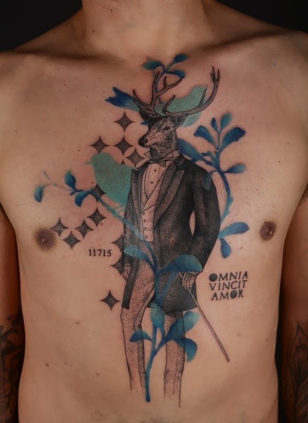 胸部超现实主义风格穿西装的鹿纹身图案