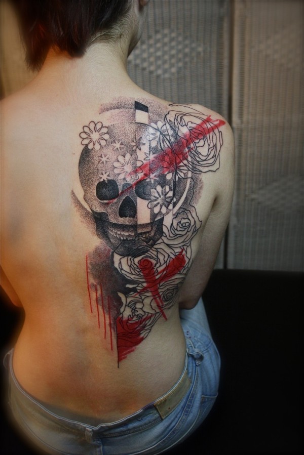 背部好看的点刺花朵骷髅与线条玫瑰纹身图案