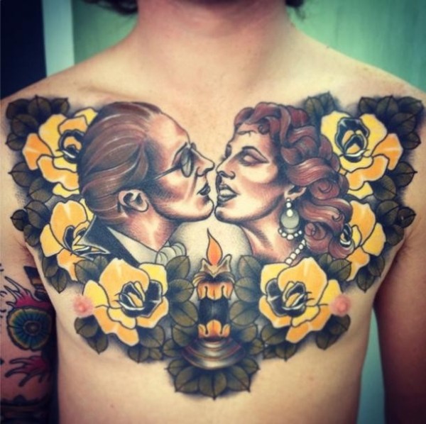 old school彩色胸部鲜花蜡烛和夫妻肖像纹身图案