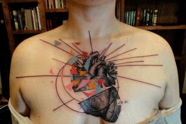 胸部切开的心脏与五彩三角形纹身图案
