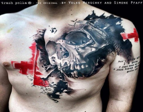 胸部红色十字架和骷髅字母纹身图案