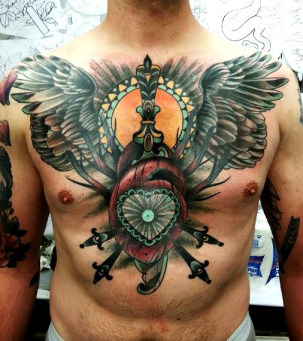 胸部和腹部彩色心脏与翅膀和匕首纹身图案