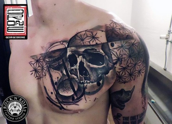 半甲装饰花纹与骷髅和沙漏纹身图案