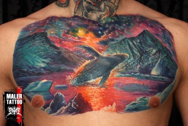 胸部惊人的彩色鲸鱼与山脉湖泊纹身图案