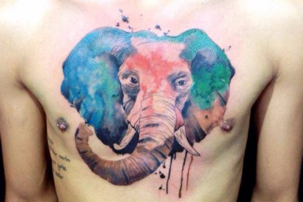 彩色水墨大象胸部纹身图案