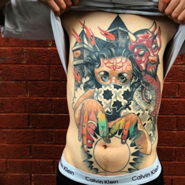old school彩色胸部和腹部神秘女人与恶魔教堂纹身图案
