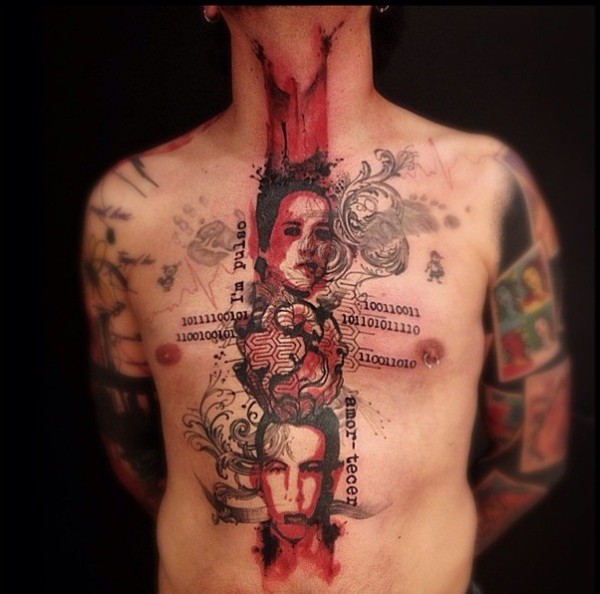 男性胸部彩色人脸画像与字母和数字纹身图案