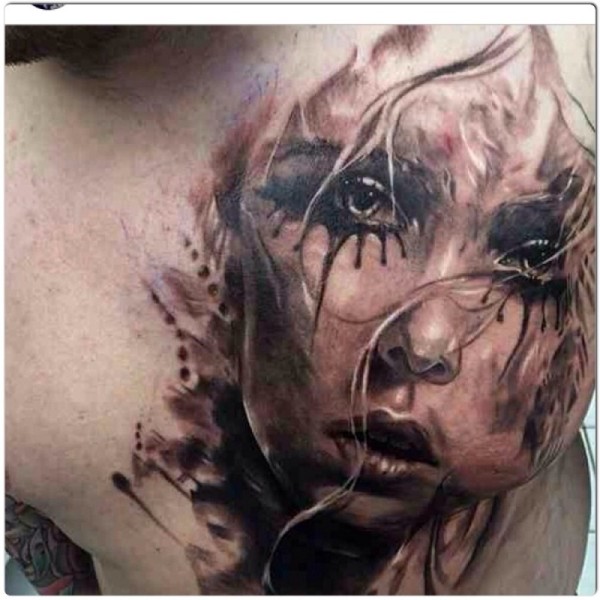 胸部令人难以置信的彩色哭泣女人脸纹身图案