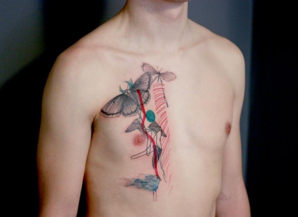 new school胸部彩色蝴蝶和女人线条纹身图案