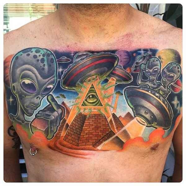 胸部彩色外星人和金字塔纹身图案