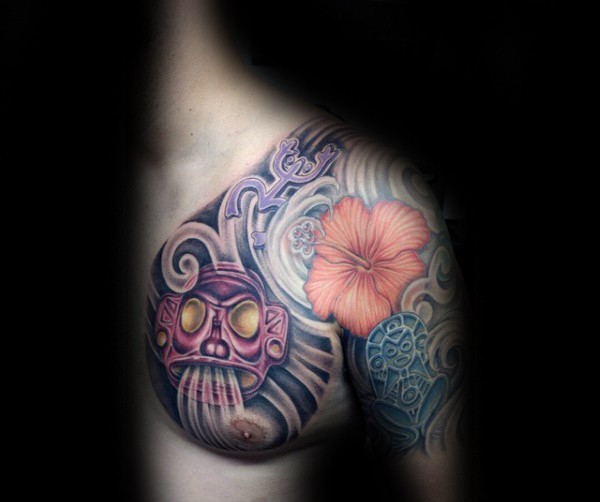 半甲彩色雕像和花朵纹身图案