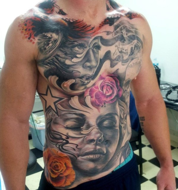 胸部和腹彩色各种人像和鲜花纹身图案