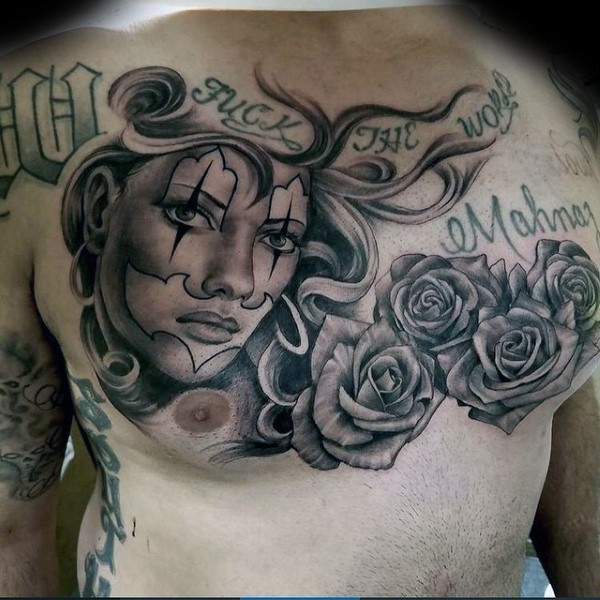胸部new school彩色玫瑰字母和女人肖像纹身图案