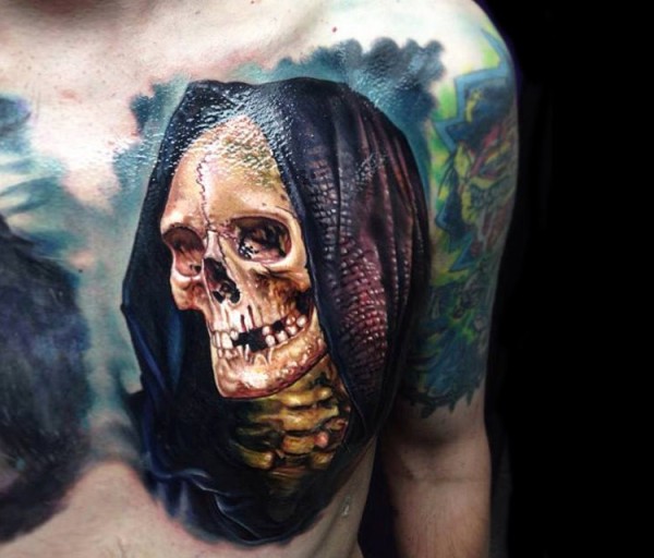 胸部写实的彩色骷髅骨架与遮光罩纹身图案