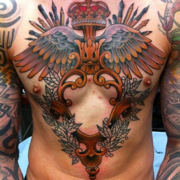 胸部华丽彩色框架与翅膀和皇冠纹身图案
