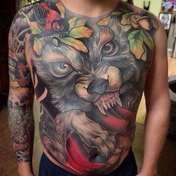 胸部和腹部彩绘恶狼头像和小鸟纹身图案