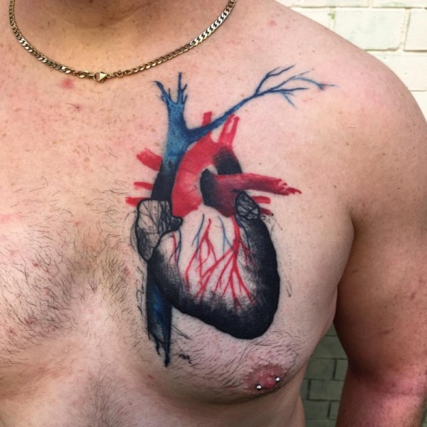 胸部逼真的彩色人体心脏纹身图案