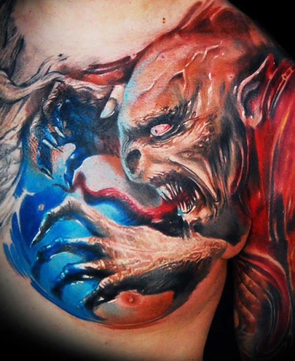 半甲彩色恐怖风格邪恶恶魔纹身图案