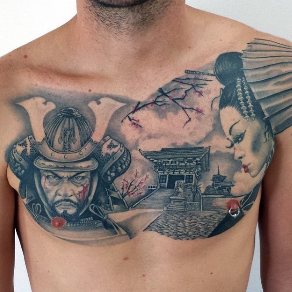 胸部日本传统风格彩色武士艺妓房屋纹身图案